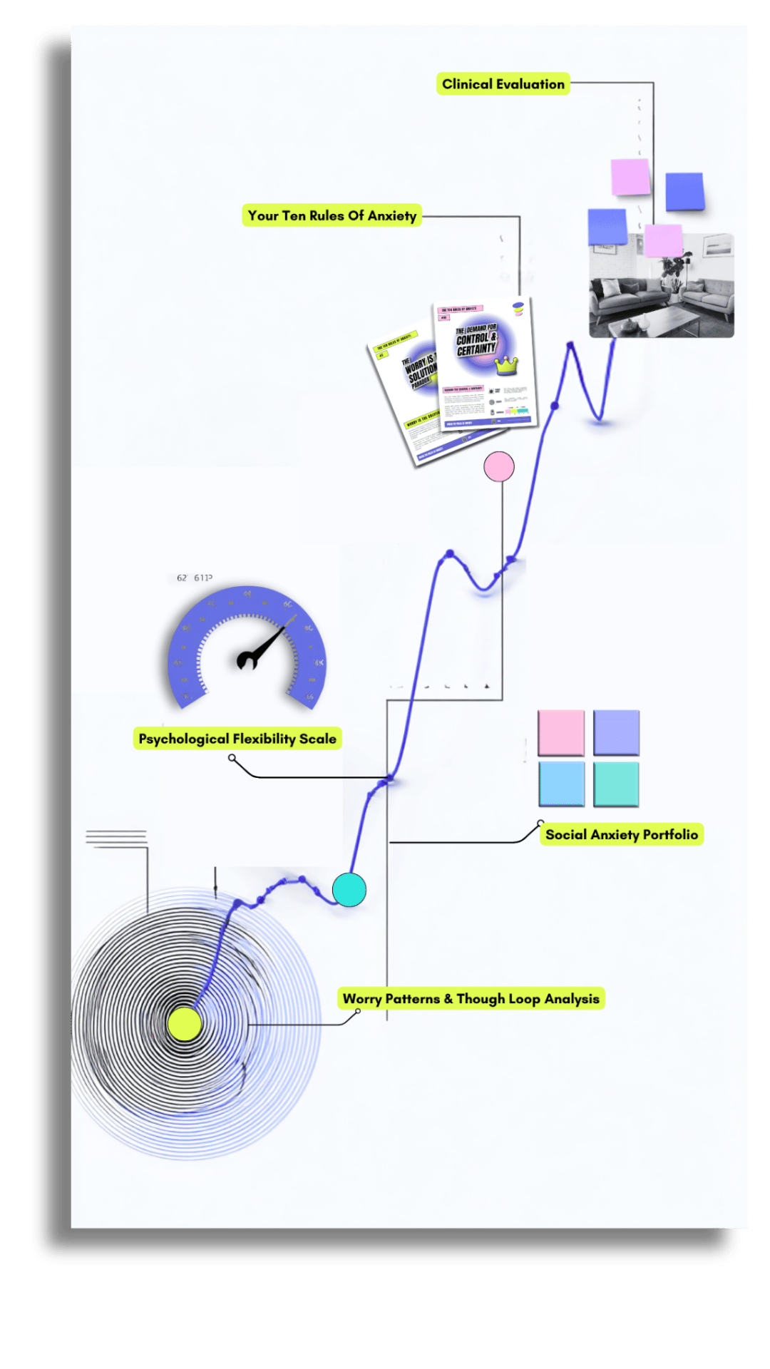 Through a series of online clinical assessments and a focused evaluation with a trained therapist you'll discover the specific patterns driving your anxiety:Â